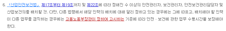 "사업주 또는 경영책임자 등은 안전관리자, 보건관리자가 안전보건에 관한 업무를 겸직하는 경우 안전보건에 관한 업무 수행에 지장이 없도록 하여야 한다." 라고 정해두었다.